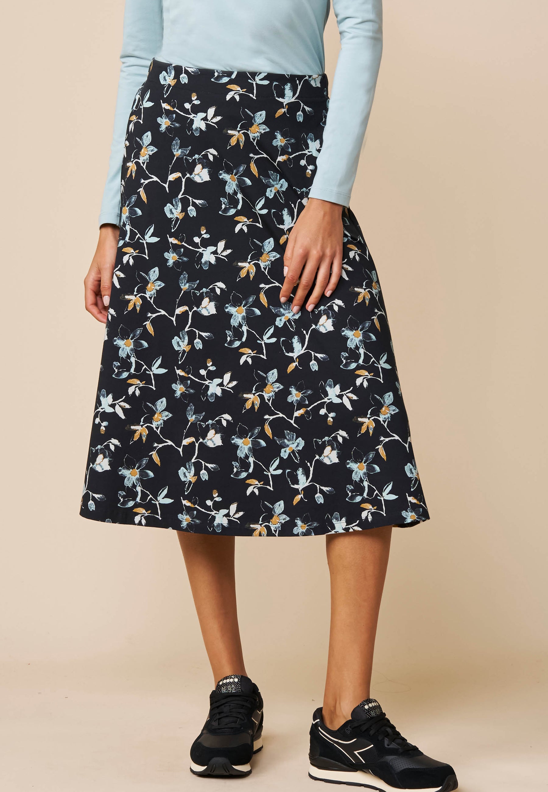 Ein knieumspielender Rock in A-Linie, der jede Bewegung mitmacht. Der breite, teilelastische Bund sorgt für eine gute und zugleich komfortable Passform. Ein Rock für viele Gelegenheiten!