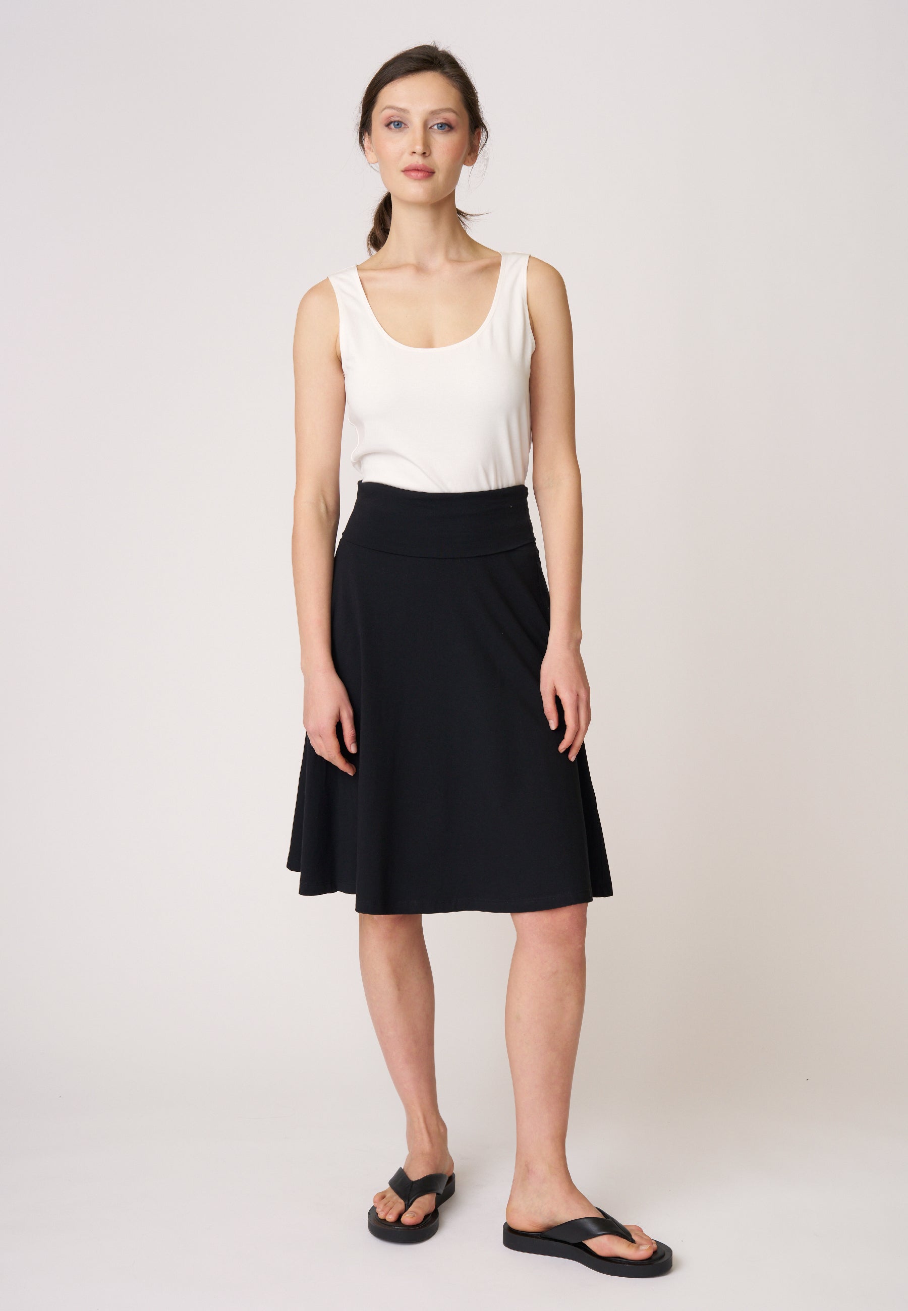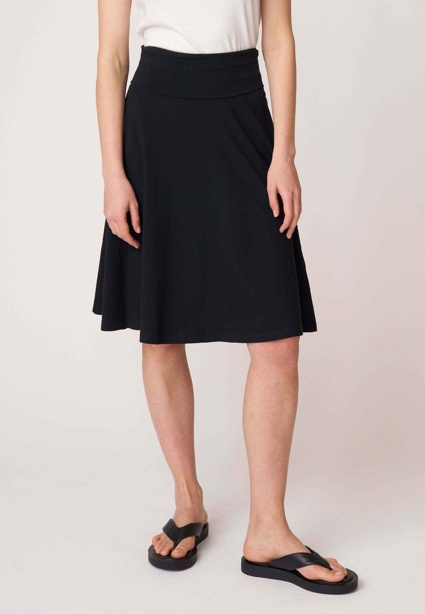 Rock Doreen ist ein echter Klassiker und begeistert seit vielen Saisons mit seinem schlichten, durchdachten Design. Der knielange Schnitt mit ausgestelltem Saum in A-Linie sorgt für eine zeitlose Silhouette. Besonderes Highlight ist der hohe, elastische Bund, der sich flexibel tragen lässt – so können Länge und Bundform individuell variiert werden. Ein vielseitiges Essential für eine nachhaltige Garderobe.