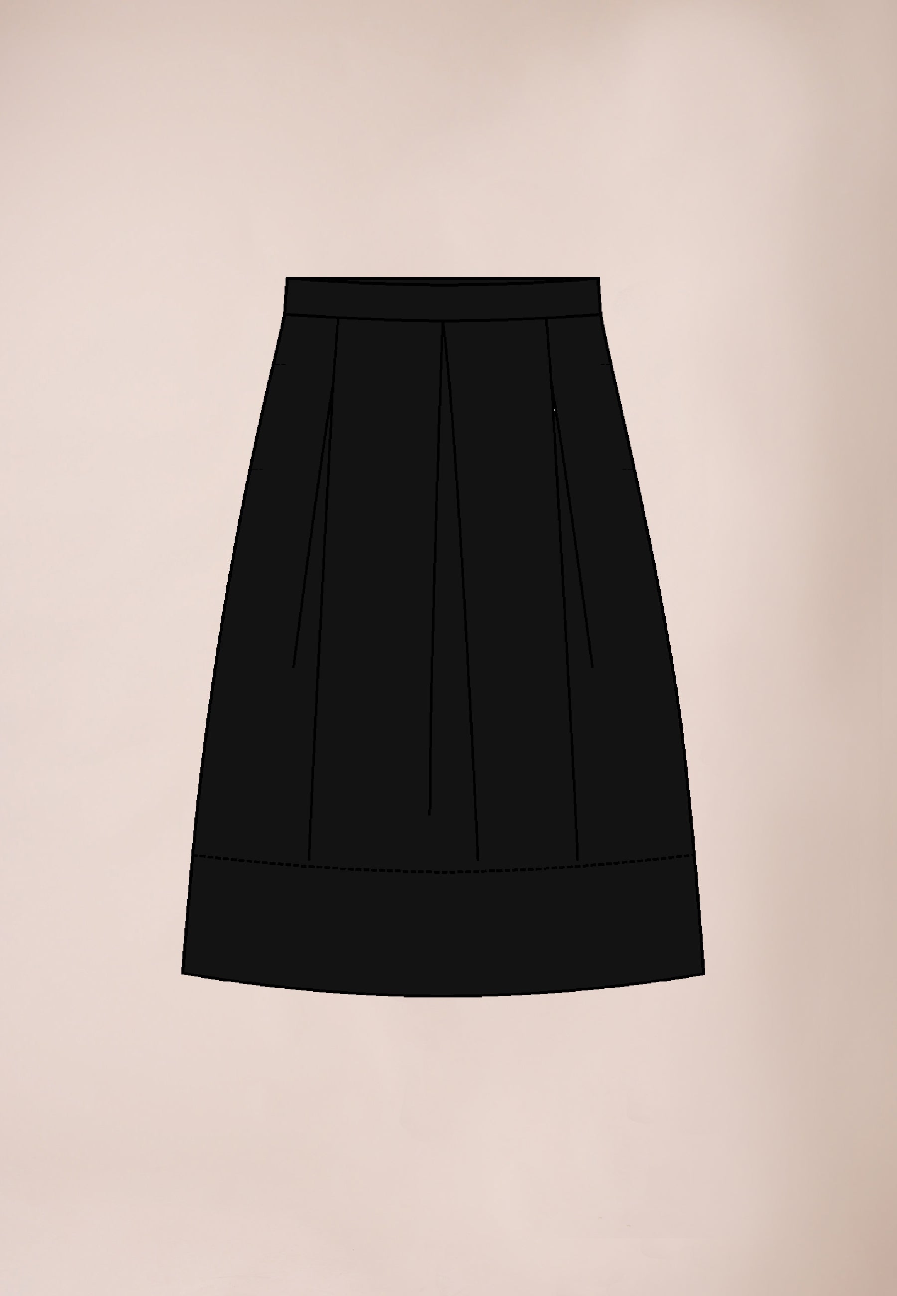 Ein knielanger Rock, der seine schöne Saumweite durch drei, in unterschiedlicher Höhe aufspringende, tiefe Kellerfalten im Vorderteil erhält. Geschlossen wird er in den hinteren Mitte mit einem Knopf und Reißverschluss. Die breite, doppelt gelegte Saumblende, Iässt das Rockvolumen voller und eleganter fallen.